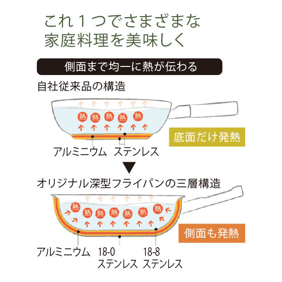 側面までしっかり熱が伝わる三層構造だから食材に素早くムラなく熱が通り、より美味しく調理できる優れもの。IHでも鍋全体に熱が伝わります。