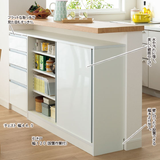 鏡面カウンター下引き戸収納庫