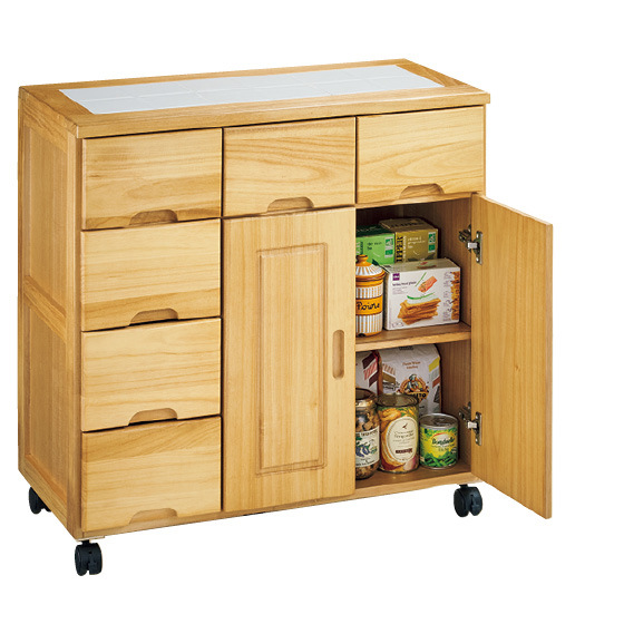扉と引き出しを使って仕分け収納。天板はおしゃれなタイル貼り。