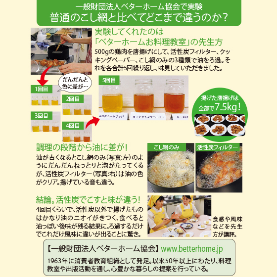 活性炭に加え、業務用などで使われている、油の酸化を抑制する脱酸ろ助剤を配合。