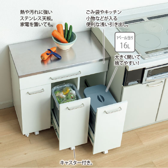 ●材質:本体=プリント紙化粧パーティクルボード・プリント紙化粧繊維板、ペール=ポリプロピレン、天板=ステンレス鋼