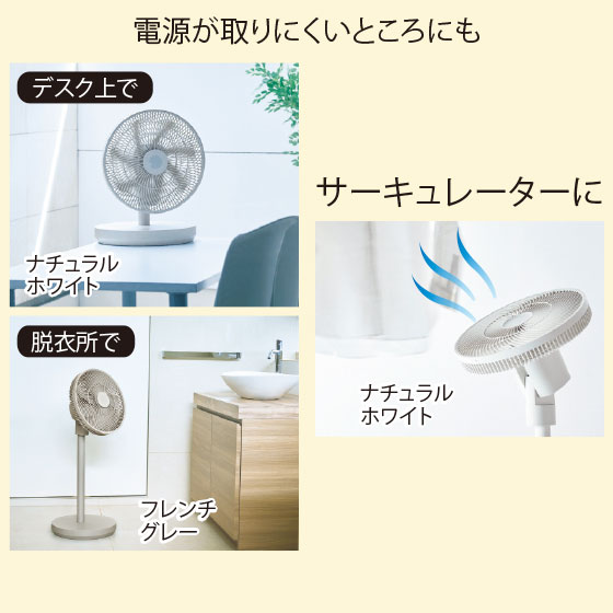 軽々と持ち上げられる、コードレスのDCファン。上下左右と幅広く首振りする「3Dモード」や、外気温を検知して風量を自動調節するモードなど、うれしい機能もたっぷり。
