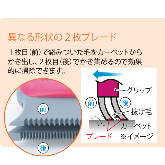 異なる形状の2枚ブレード。1枚目(前)で絡みついた毛をカーペットからかき出し、2枚目(後)でかき集めるので効果的に掃除できます。