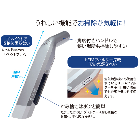 なんといってもこの軽さ、コンパクトさが使いやすい! 最近はスタンド式も増えていますが、取り回しのよさは本品に軍配が上がります。高性能なブラシレスモーターを搭載しつつ、わずか600gの超軽量ボディを実現。サッと取り出せて気軽にお掃除できます。エコモードなら約30分連続使用でき、あちこち掃除しても疲れ知らず。空気清浄機などに使用されているHEPAフィルター採用で、排気がきれいなのもうれしいですね
