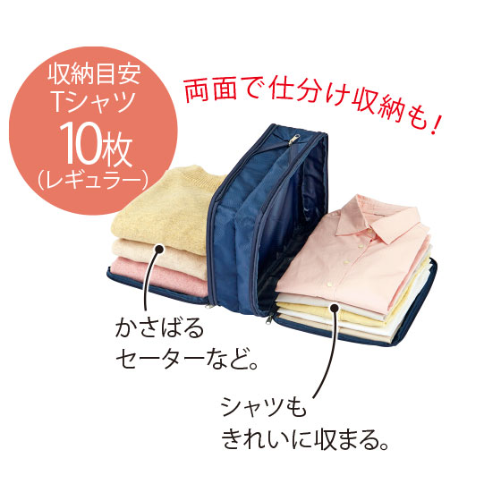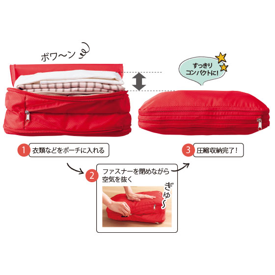 旅行時の荷物をコンパクトに!掃除機不要、ファスナーを閉めるだけでかさばる衣類を圧縮。折りジワも少なくてすみ、衣替えにも重宝します。
