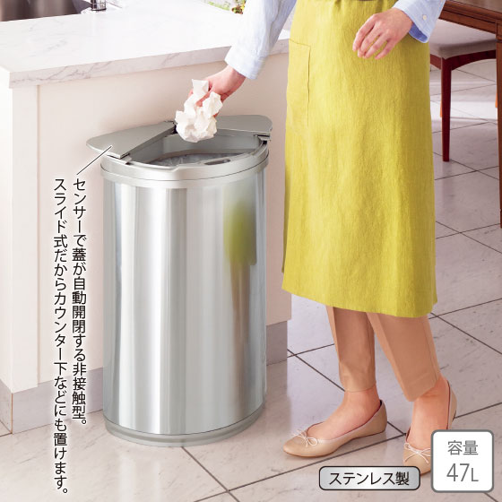 スライド式の蓋だからカウンター下などにも設置可能。お手入れしやすいステンレス製。