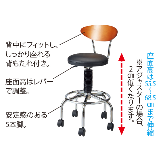 ●サイズ:幅42×奥49×高79〜92(キャスター時)・77〜90(アジャスター時)cm、座面=幅36×奥36×高55.5〜68.5(キャスター時)・53.5〜66.5(アジャスター時)cm