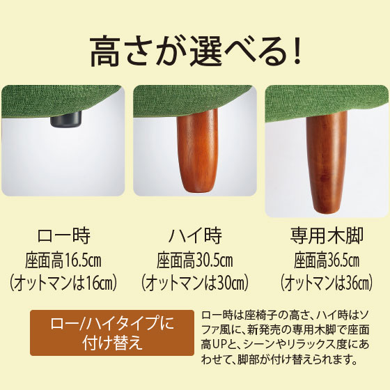 ポケットコイル入りの座面はヘタリにくく、独立したコイルが体の形に合わせてフィット。シーンに合わせて脚部はロー・ハイタイプに付け替え可能です。