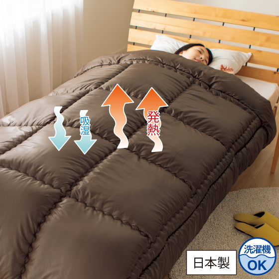 暖かいだけでなく、掛けているのを忘れるほど軽い!だから眠っている間はもちろん、上げ下ろしも楽ちんです。ダニを通しにくい高密度の肌触りなめらかな側地と吸湿発熱する中わたで、ぬくぬくの使い心地。丸洗いできるのもうれしいポイントです。