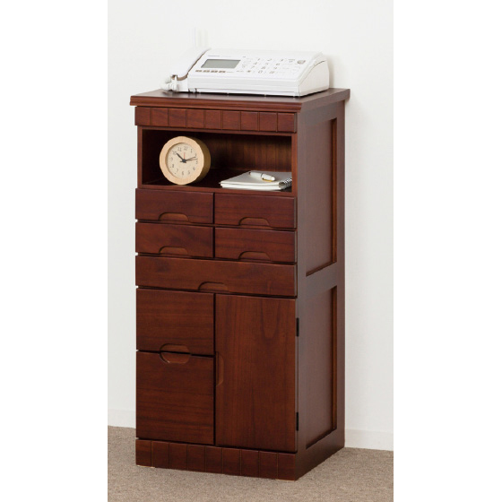 最上段は小物が探しやすい深さ2cmの引き出し。中段の引き出しは印鑑やカギなど、すぐに使う小物を入れるのに便利!下段は、入れる物に応じて深さが選べる引き出しと電話帳や雑誌を立てたまま入る扉付き収納も。