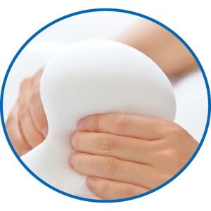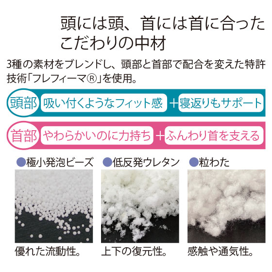 頭を支えるだけでなく「首を休められる枕」にしたいと考え、頭部と首部で全く別の役割がある枕を開発しました。こだわったのが中材。特許配合技術「フレフィーマ(R)」を使用し、素材の割合を頭部と首部で大きく変えました。