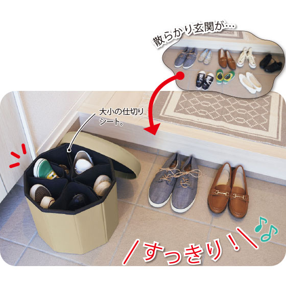 ちょこんとたたずむスツール。中に履物などを立てて、こっそり収納できます。玄関の隠し収納のほか、リビングの小物にも。