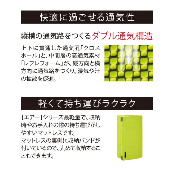 マットレスにおける生活者のニーズで多かった寝心地、通気性、軽量感を向上させることを目指しました。通気性とクッション性を高めることにより体への負担を軽減させ、一年中快適にお使いいただけるようこだわって開発を行いました。