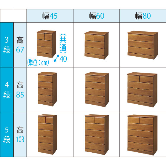 ●サイズ:幅44.5(幅45)・59.5(幅60)・80(幅80)×奥40×高67(3段)・85(4段)・103(5段)cm