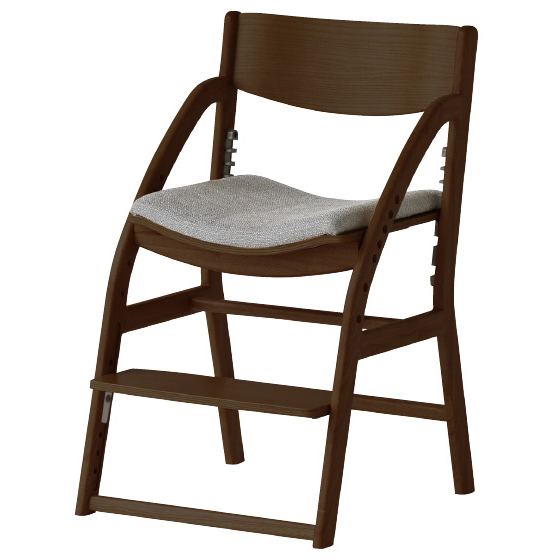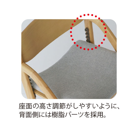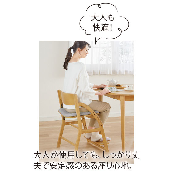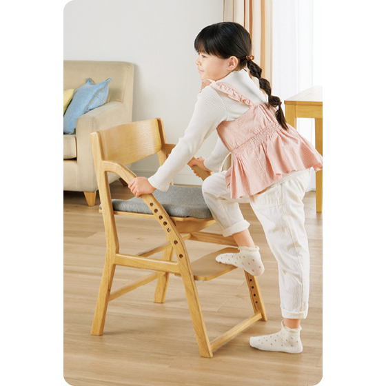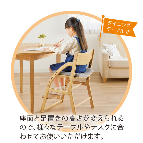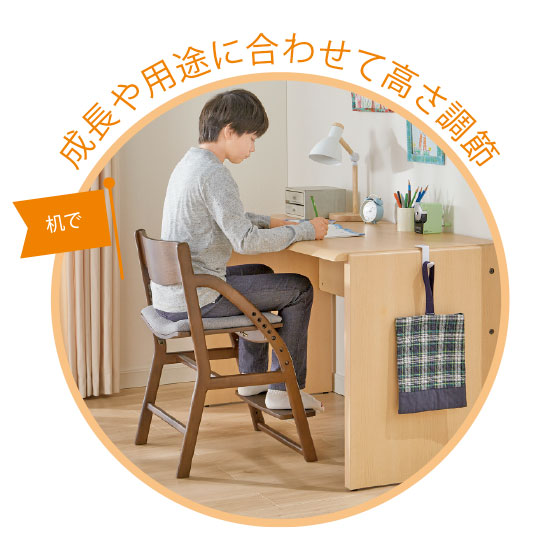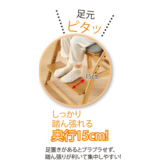 足がブラブラと動く状態では踏ん張りが利かず姿勢を保つことは困難。身長に合わせて座面と足置きの高さを調節できるので、よい姿勢でしっかりと集中して学習や食事ができます。