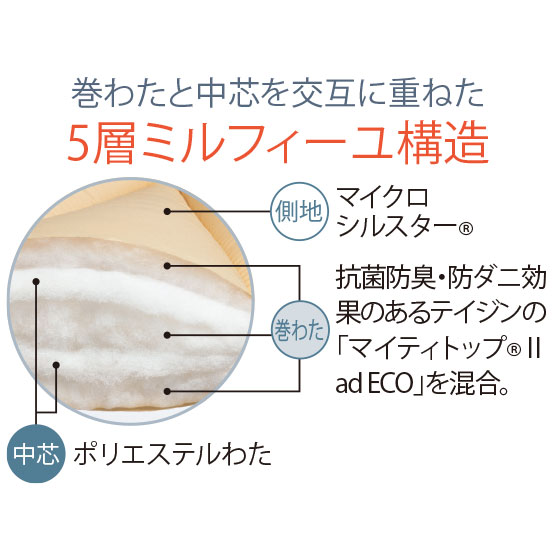高密度に織り上げることでダニの侵入を防止。ホコリが出にくくさらっとした肌触りです。巻わたと中芯を交互に重ねた5層ミルフィーユ構造。