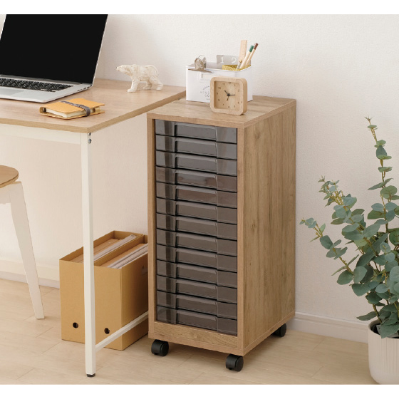 見やすいA4 サイズ対応のアクリルの引き出しがたっぷり13段。