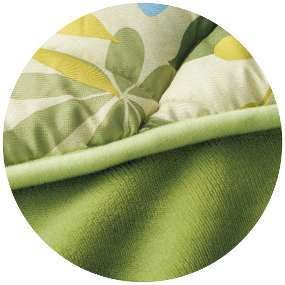 表側はさわやかなリーフ柄。裏側はふんわりやわらかな感触で温もり感のあるフランネル。