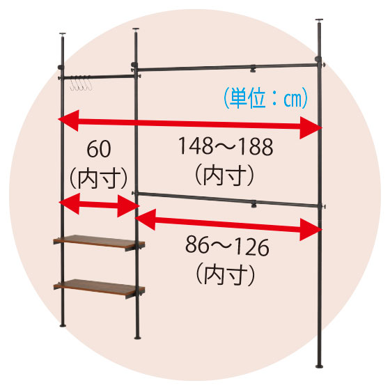 ●耐荷重:25kg(パイプ1本当り)、棚板=5kg(1枚当り)