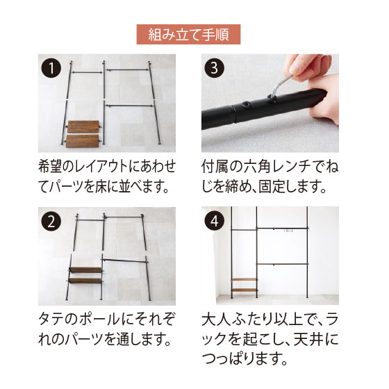※天井つっぱり仕様商品は設置場所の床・壁・天井の強度をご確認ください。必ず水平で硬い床面に設置し、天井はつっぱり部分が全面に接し 平らで強度があることを確認してください。(吊り天井など下からつっぱったときに持ち上がってしまうと、つっぱり強度が保てない場合があります)