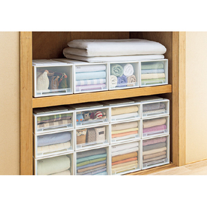 クローゼットの下に並べて使用。奥行きがあるので、かなりの物を収納できます。引き出しだけの入れ替えが出来るので、季節ごとに、ベストの位置で使えます。