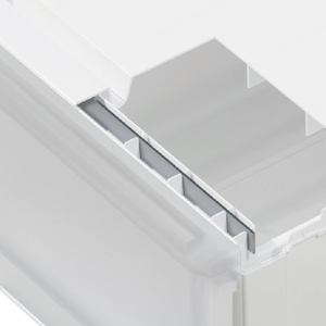 積み重ね時に前倒れを防止するジョイント具やインデックスシール、床を傷つけにくいゴム製脚など充実仕様。