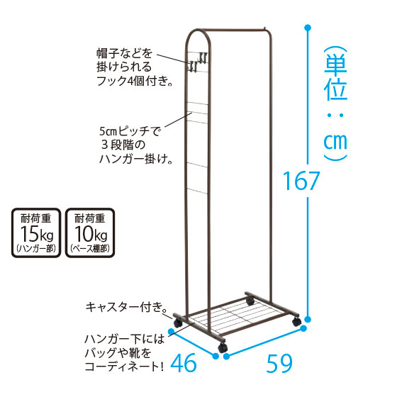 ●耐荷重:ハンガー部=15kg、ベース棚部=10kg