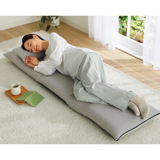 3カ所を角度調節して好みの形に。通年使いやすい肌触りの良い張地。枕や背当てとして使えるクッション付き。