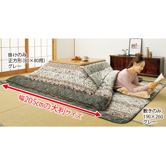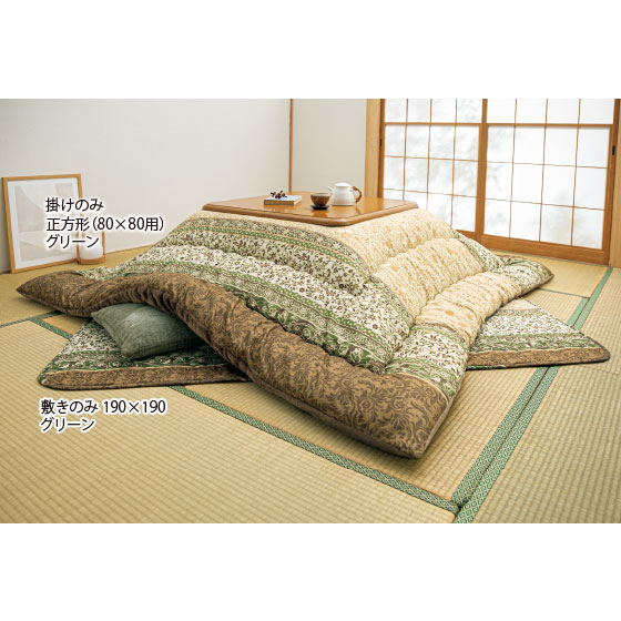●素材:<掛け>表側・裏側=ポリエステル100%、中材=ポリエステル100%(正方形(80×80用)=2.2kg、長方形(80×105〜120用)=2.5kg、長方形(90×150用)=3kg、長方形(90×180用)=3.4kg)、<敷き>表側=ポリエステル100%、裏側=ポリエステル100%(不織布張り)、中材=ポリエステル100%・ウレタンフォーム(190×190=0.3kg、190×240=0.38kg、190×260=0.41kg、190×290=0.46kg)、<上掛け>ポリエステル100%