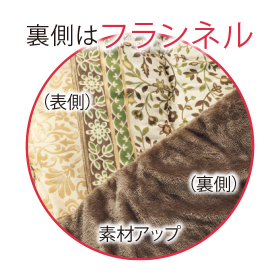 掛けふとんの表側はなめらかな起毛感のピーチスキン、裏側はふんわり暖かく肌触りのよいフランネル素材を使用。軽くて保温・弾力・かさ高性に優れた中空構造の中わたを使用しています。※掛けのみ。