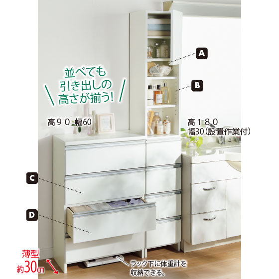 すっきり置けて、たっぷり入る!脱衣所にちょうどいい薄型チェスト。
