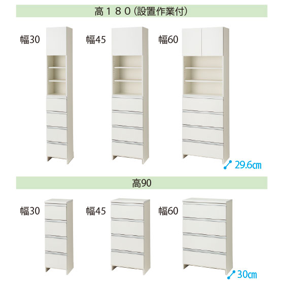 ●サイズ:幅29.6(幅30)・44.6(幅45)・59.6(幅60)×奥30(高90)・29.6(高180)cm