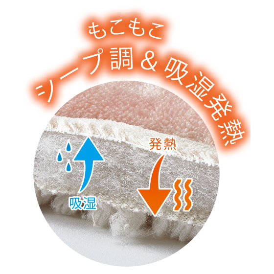 肌面は羊みたいにふわもこ。吸湿発熱わた入りで暖かくムレにくい。