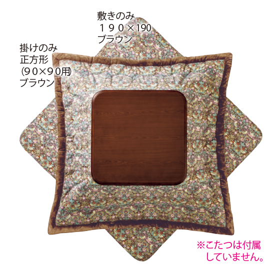 ●素材:<掛け>表側=ポリエステル55%・綿45%、額・裏側=ポリエステル100%、中材=ポリエステル100%(正方形(90×90用)=1kg、長方形(90×120用)=1.2kg、長方形(90×150用)=1.5kg)、<敷き>表側=ポリエステル55%・綿45%、裏側=ポリエステル100%(すべり止め付き)、中材=ポリエステル100%(固わた、190×190=1.4kg、190×240=1.8kg、190×280=2.1kg)