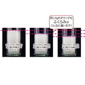 ※ダウンパワー(DP)とは、JIS規格で定められた羽毛の品質のグレードを示すものです。なお、かさ高とはふとんの厚みではありません。