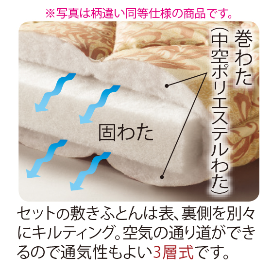セットの敷きふとんは表、裏側を別々にキルティング。空気の通り道ができるので通気性もよい3層式です。
