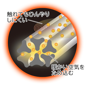 肌触りのなめらかなフランネルの毛足には、トラス形状のフランネルリッチ糸を使用。冷たく感じやすい平らな面になりにくく、凹凸とすき間をつくるので、触れた瞬間のヒヤッと感を抑え、すぐに暖かい空気をため込みます。吸湿発熱効果もあり、暖かさをさらにプラス!
