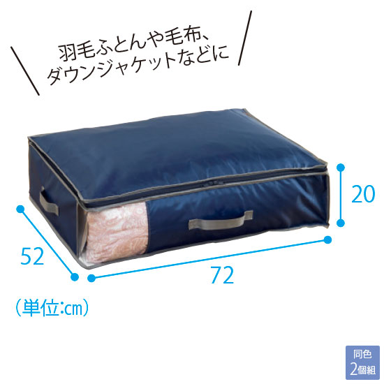 幅広テープを留めるだけで、かさばるふとんや衣類をソフト圧縮できます。底面シートには吸湿・放湿性に優れた「ベルオアシス(R)」を使用。消臭機能(アンモニア・酢酸)で気になるニオイも対策。