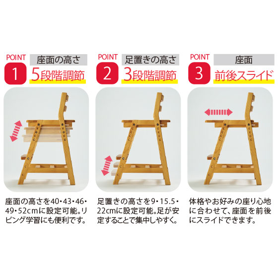 座面の高さを40・43・46・49・52cmに設定可能。リビング学習にも便利です。足置きの高さを9・15.5・22cmに設定可能。足が安定することで集中しやすく。体格やお好みの座り心地に合わせて、座面を前後にスライドできます。