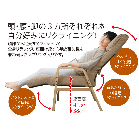 頭・腰・脚の3カ所それぞれを、自分好みにリクライニング!頭部から足元までフィットして全身リラックス。座面は座り心地と耐久性を兼ね備えたスプリング入りです。