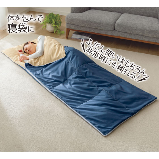 体を包んで寝袋に。広げて肌掛けふとんに。袋に入れてクッションに。ふだん使いはもちろん非常時にも頼れる!