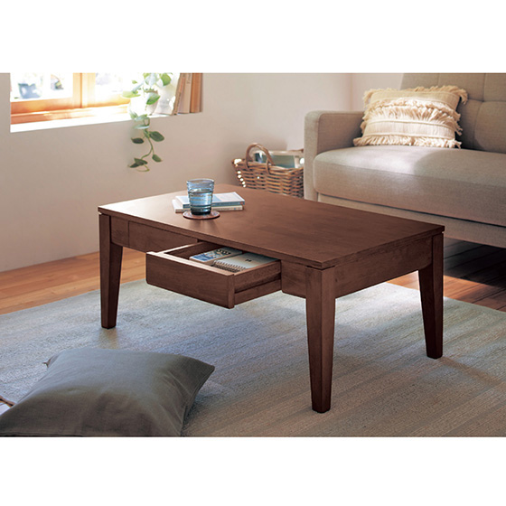 リモコンや文具、新聞など散らかりがちな小物を片付けるのに便利な引き出し付きテーブル。(引出し内寸24.5cm×38.5cm×6cm)