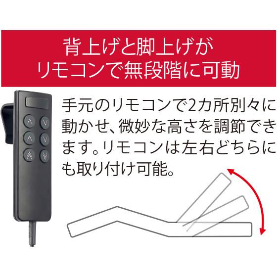 内蔵されたウッドスプリングにより、長時間寝ていても体に負担をかけにくい硬めの感触に。さらに、側面を硬めのウレタンで補強し、マットレスの端が沈み込みにくく、立ち上がりもスムーズです。背上げと脚上げが無段階調節できるリモコン付きです。