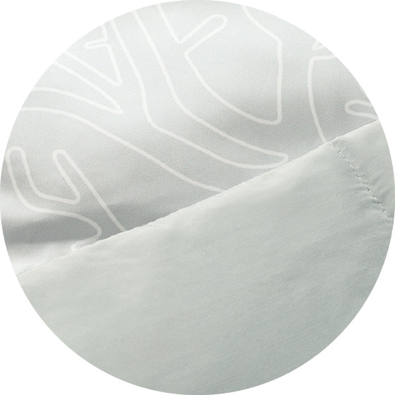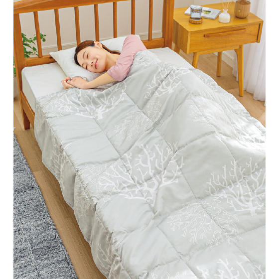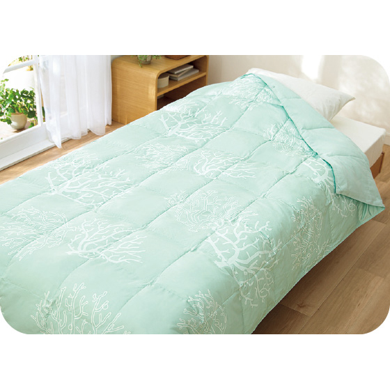 高密度に織られた側地は肌触りなめらかで、ダニを通しにくい。軽さ、やわらかさに優れたテイジンの「マイクロフラッフィー(R)」に再生繊維セルロースを配合し、吸放湿性をもたせた特殊な中わたを使用。