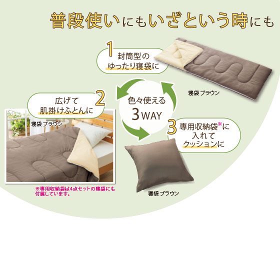 ●素材:寝袋=表側/ポリエステル100%、裏側/毛羽部=綿100%、グランド糸=ポリエステル100%、詰めもの/ポリエステル100%、収納袋/ポリエステル100%、マットレス=側地/ポリエステル100%、中材/ウレタンフォーム、枕=側地/ポリエステル100%、中材/ウレタンフォーム、収納バッグ=ポリエステル100%