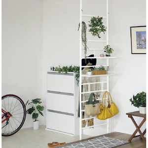 段差があっても安定感よく設置可能。スプリング内蔵の突っ張り金具とスチール製ネジでしっかり固定できます。魅せる収納が楽しめる棚とフック付き。収納するものに合わせて好きな位置に取り付けられます。