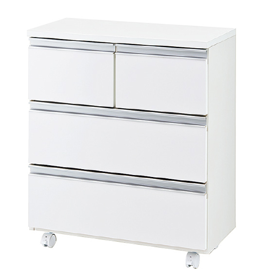 天板と前板はお手入れしやすい鏡面仕上げ。出っ張りのないフラットタイプの取っ手。幅広の引き出しはスライドレール式。