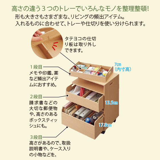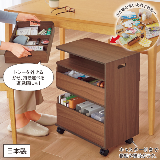 定位置がはっきりせず迷子になりやすいリビング小物。せっかくリラックスしようとしたのにメガネやテレビのリモコンがない…。それなら、こんなワゴンにまとめるのがおすすめ。移動できるからソファ横や寝室など、必要なところへ出張できます。トレー型の引き出しは、外せるので単体でも使用可能。テーブル下にも収まり邪魔になりません。