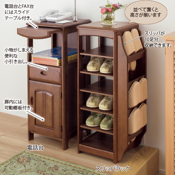 ●サイズ:スリッパラック=幅35×奥31×高80cm、電話台=幅32×奥33×高80cm、FAX台=幅43×奥35×高80cm