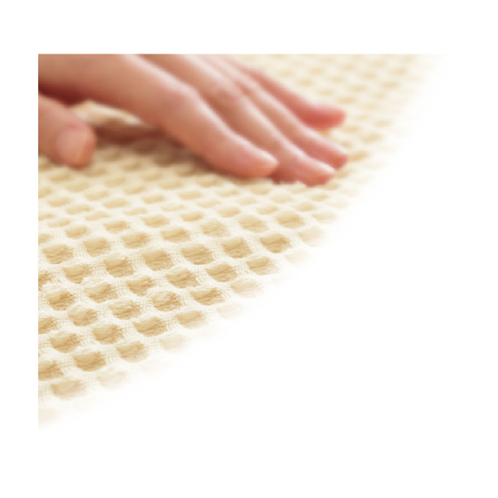 糸の段階だけでなく、織り上げた生地の段階でも熱湯と洗剤で洗浄し、縮みにくいワッフル織に。厚手で一年中使えます。
